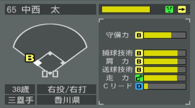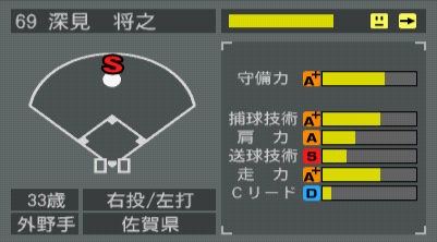 鉄壁の守備持ちで守備力がA+の後半まで伸びる早熟の守備型外野手。