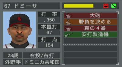 | ドミーサ | .350 | 627 | 220 | 19 | 2 | 67 | 154 | 0 | 47 | .392 | .708 | 1.100 |